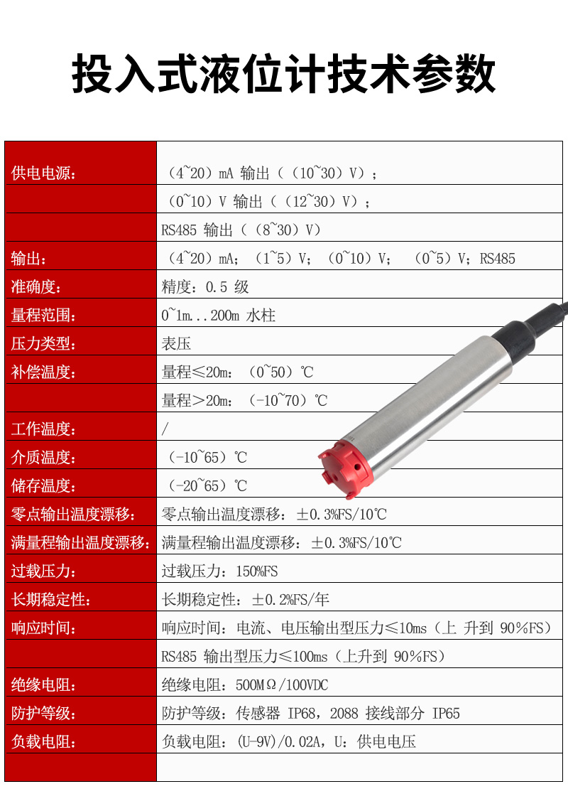 本产品精度高、体积小, 直接投入液体中,即可测量出变送器末端到液面的液体 高度,使用方便。适用于石油、化工、 电厂、城市供水、 水文勘探领域的液位测量与控制。